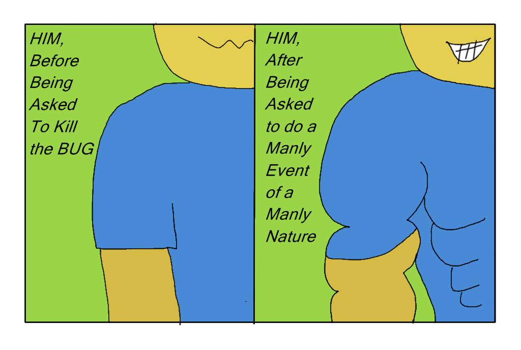 At this point the story should end. It should. It really should. HIM came back to the bedroom, killed the threatening buggie, and returned triumphantly to the living room, having proved his manhood in a incontrovertible manner. HIM would flex his biceps and leer at me saying, "The big bad bug is all taken care of, so give me some sugar, baby." End of the literary tale of a bug's woe.