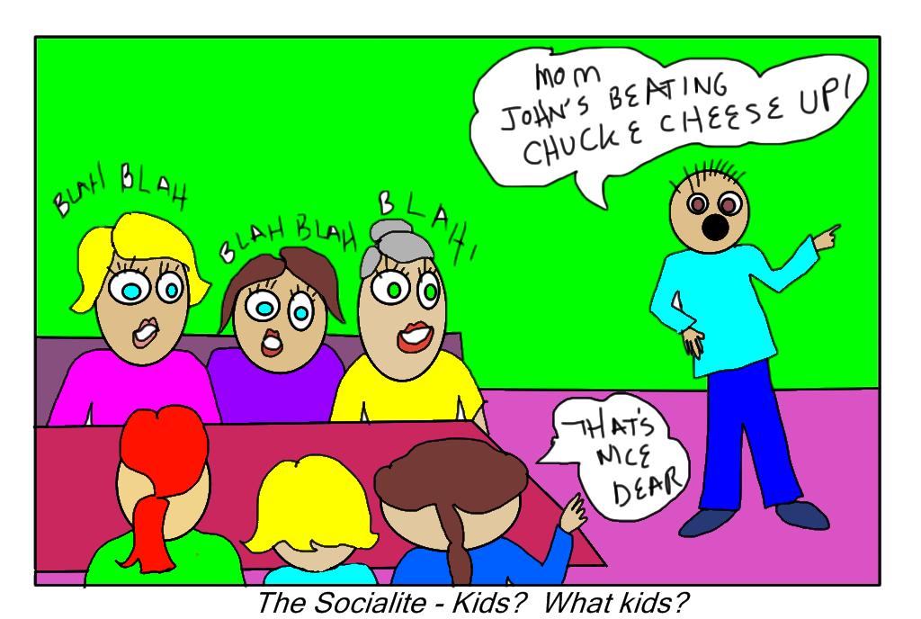 Next up is the Socialite. Here is a mommy who cannot go anywhere without a posse of gal pals. She has friends in multiples of twos and will not stop speaking/gossiping/interacting with them in order to do anything so silly as to be a parent. You see, Chuck E. Cheese has become socializing time and woe be to the parent who interrupts her precious socializing time. She might nail you with her Manelo Blahniks. Seriously.