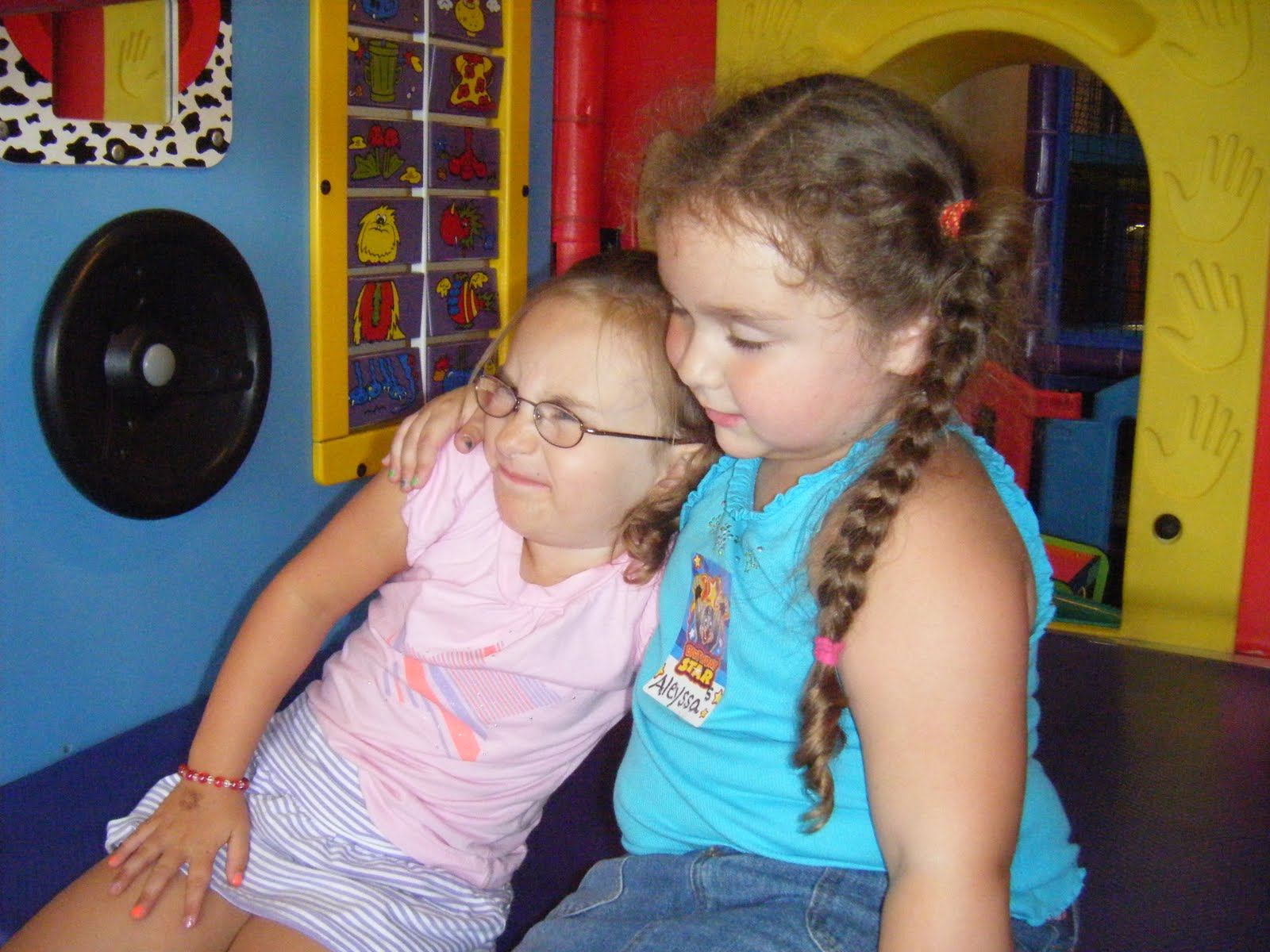 Here she is attempting to catch her breath after days of stressful playing at Chuck E. Cheese. It's my belief that she and her friend, shown here, are holding each other up.