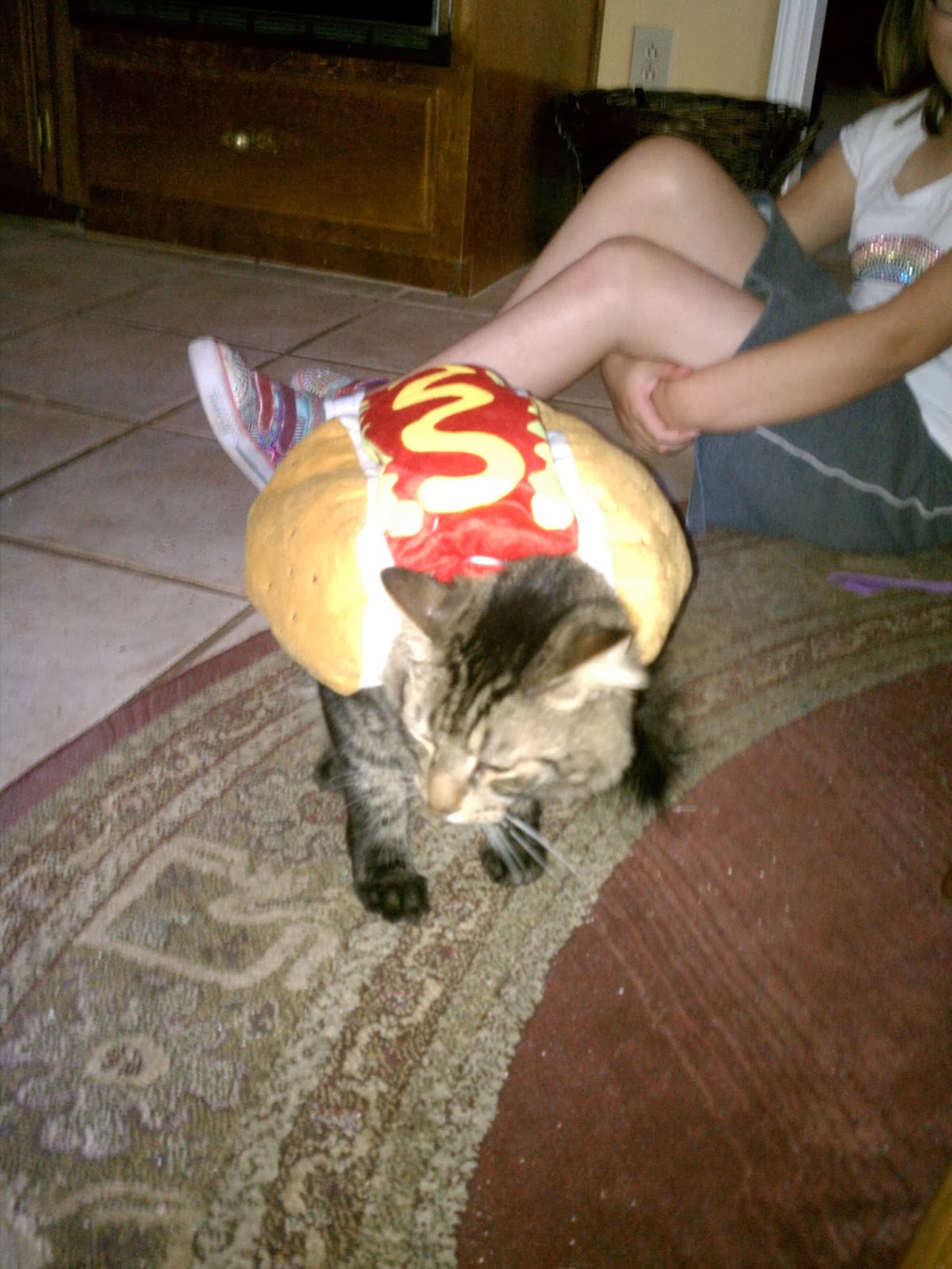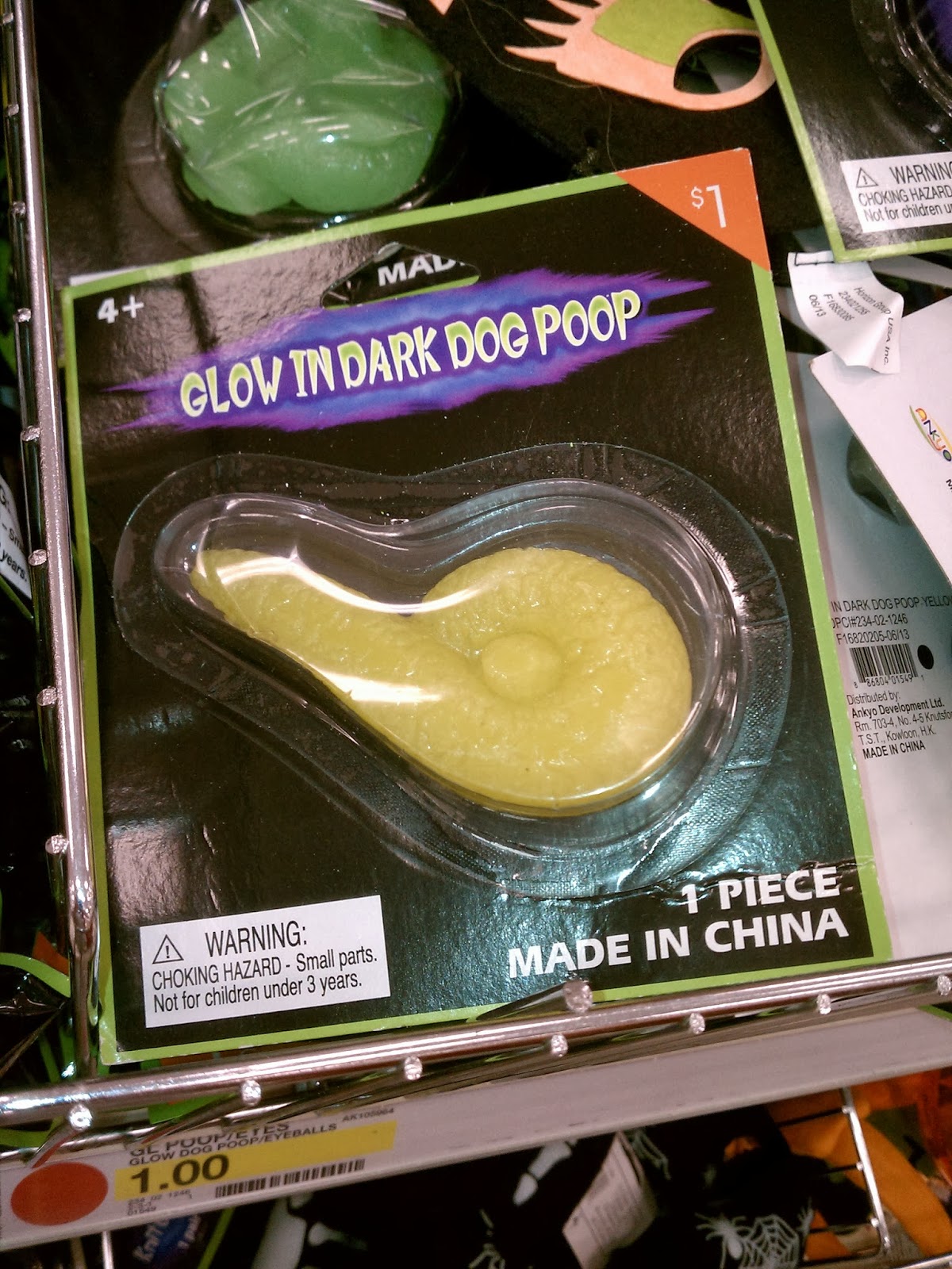 Glow in the dark dog poop. If you're going to have a dog go poo and you're out in the darkness, what better way to have glow in the dark dog poop? But hey, at least I didn't have to put the hot dog costume on the moron cat, who refused to walk in it. In fact, he was pretty pissed off about the whole thing.
