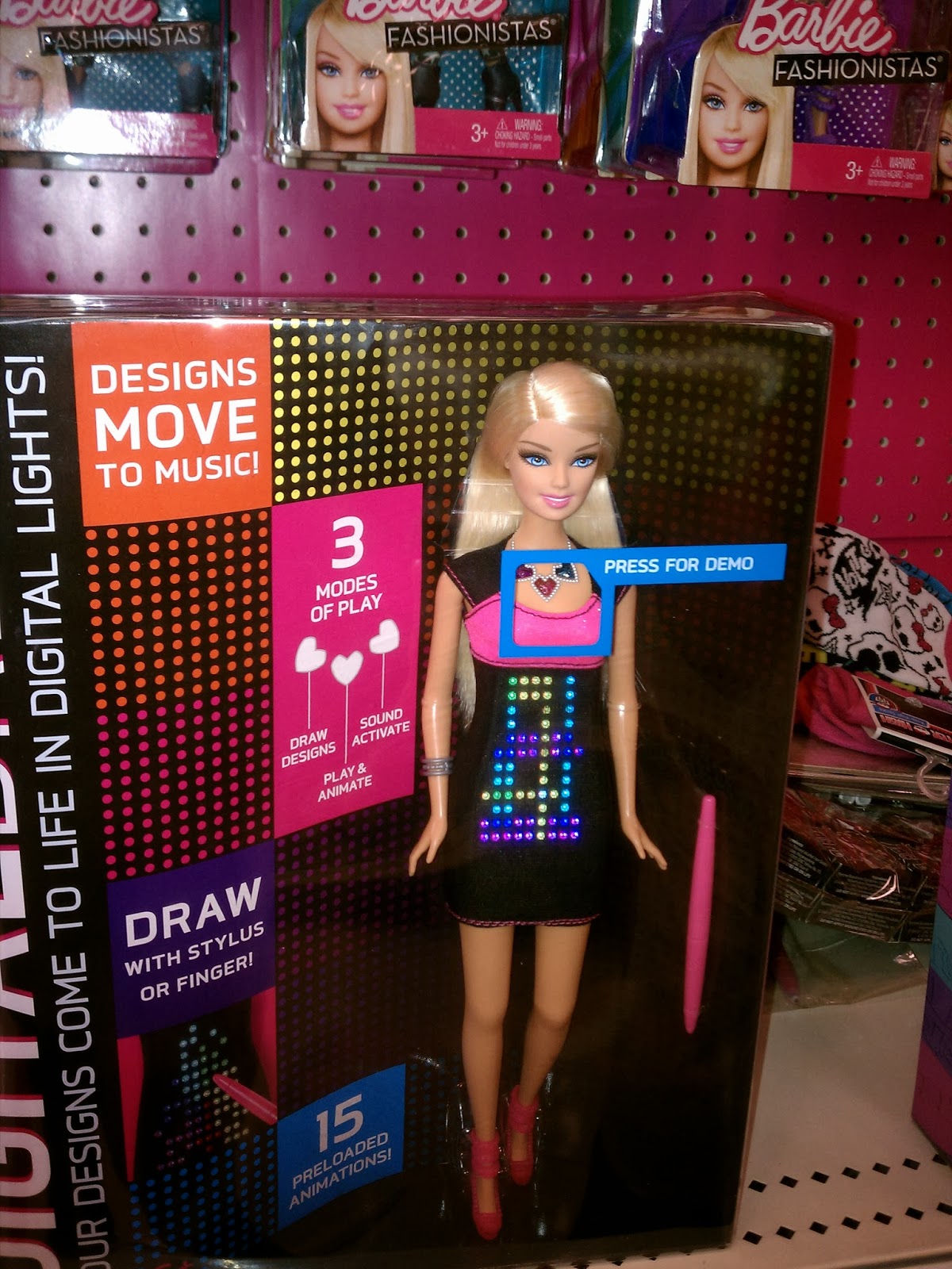 And I can't leave out Barbie, can I? This model has a light up stomach dress. Seriously, my daughter giggled. You press some button and her dress goes all Broadway Billboard. I forgot to look at the price of it because I was busy snorting.