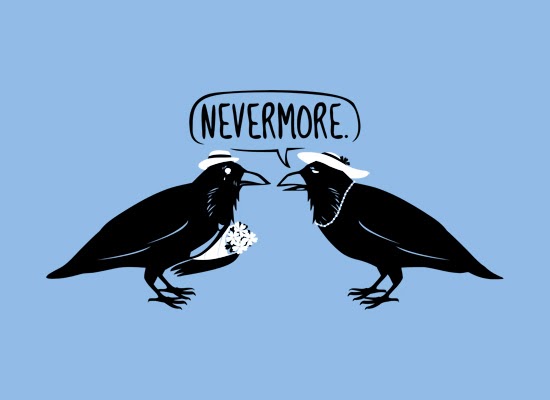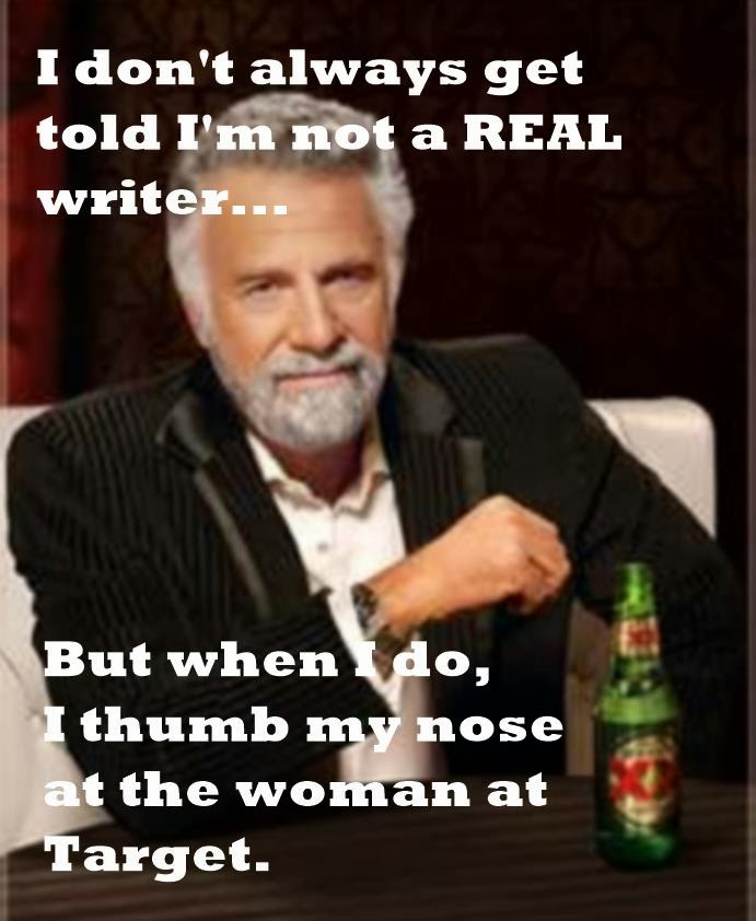 There. I run around Targets wearing strange Poe-related joke t-shirts. Well, the woman got the t-shirt and eventually the conversation turned to books because Poe = author = book reading. And the woman said, to my horror, "I only read real books." (I hadn't said anything about being a writer at that time. She just let me have it out of the blue.) Let me say that she did emphasize the word real and she said the whole sentence in a sarcastic way just to let me know what her innermost feelings of abhorrence are about not-real books. Because we all know that ebooks are not REAL books. (And somehow I managed not to kick her in the shin and throw her purse two aisles over. Hey, I would have been kicked out of Target and it would have made me sad. Plus jail time, yuck. The handcuffing would have been a real hoot, however.)
