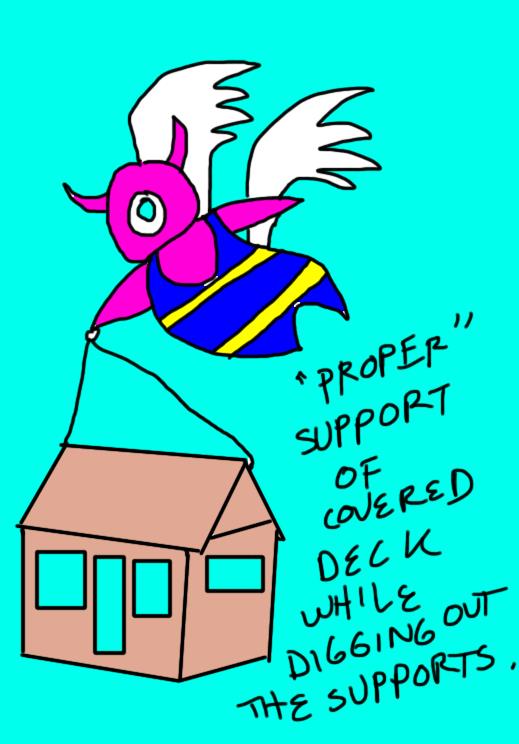 search terms in the future.At first I think, we'll dig out the concrete supports and put better ones in, all the while, the upper deck magically stays in place by itself. Or we could get magical animals to hold it up while we pour the footers.