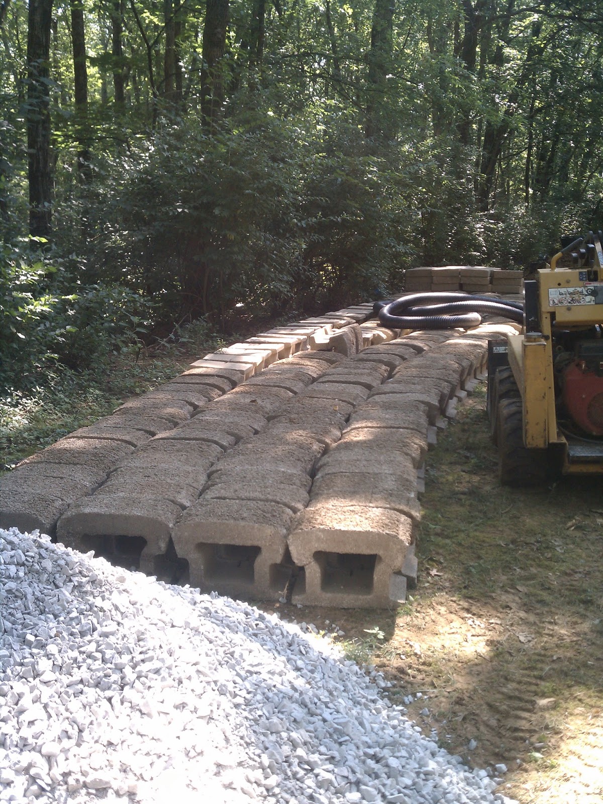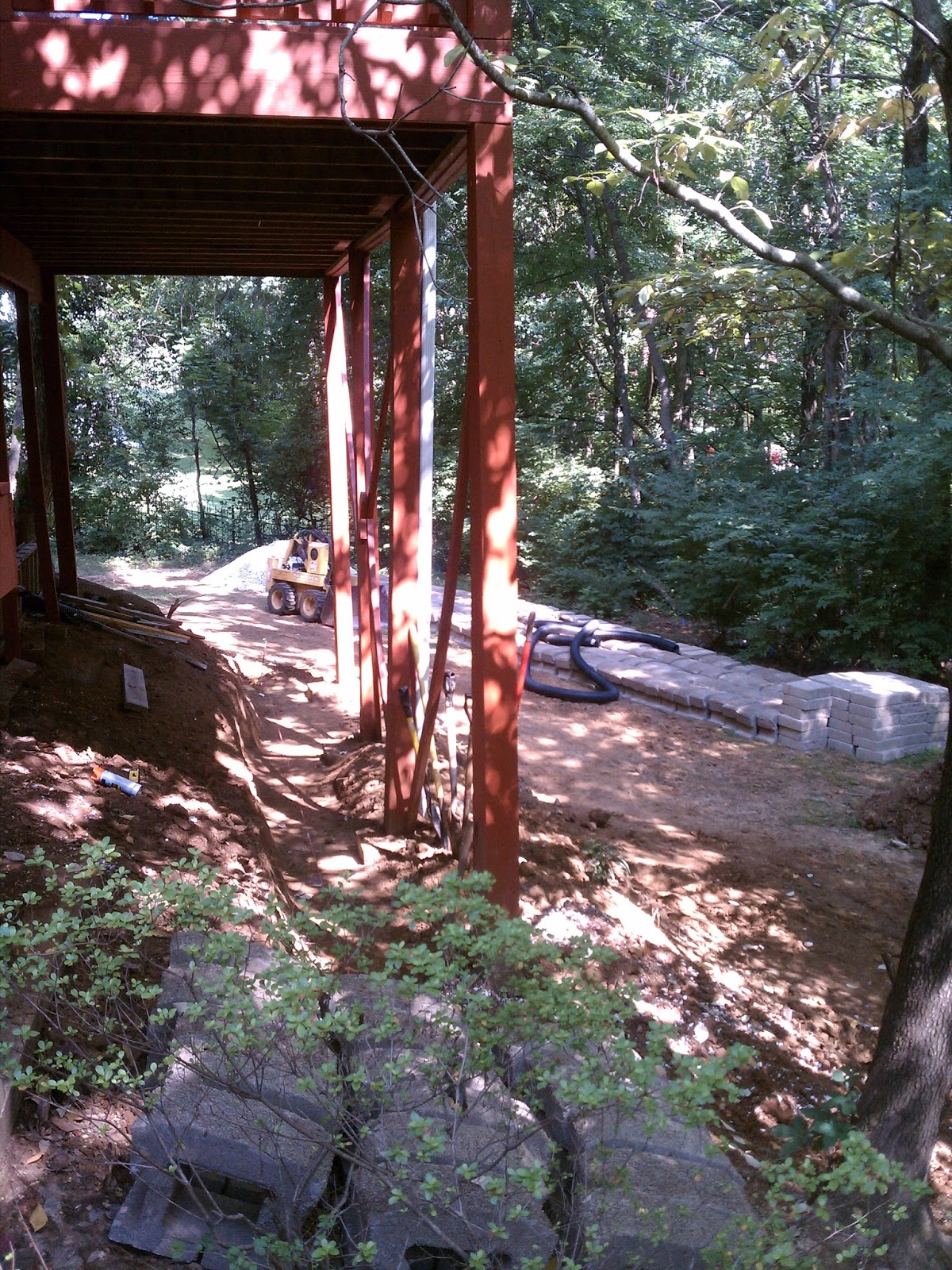I needed ibuprofen afterwards.More bricks and the trench between the supporting posts and the left side is the first retaining wall they'll build next week. Then when they're done with that, they'll build another retaining wall on the right side of the supporting posts. Then we'll eat Ramen noodles for a year. When people ask me why I wear a t-shirt with holes in it, I just say I spent my money on a retaining wall instead. The tree to the right of the photo above is our tilting dogwood, which may or may not fall down. We've asked it but it isn't talking.
