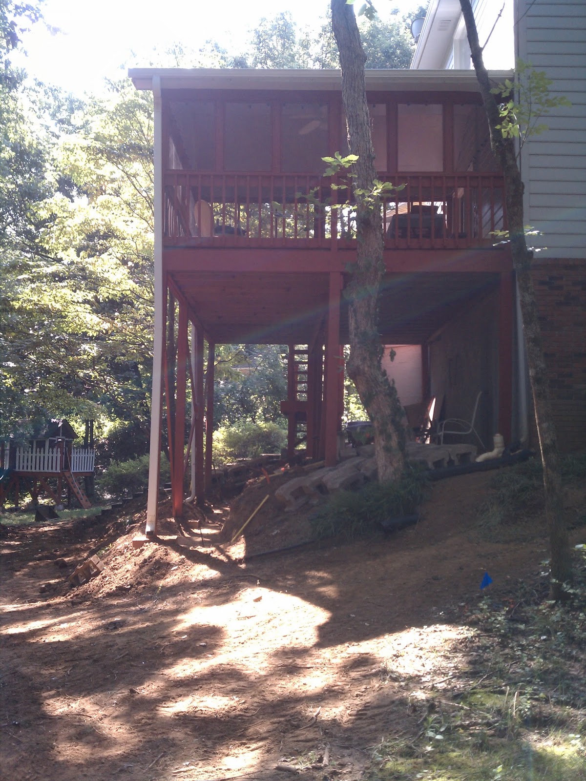 shore up the deck. It didn't work.The picture above is the back of the deck as seen from the backyard. It looks fun and cool but it's a big muddy mess. I have a special pair of tennis shoes I've been using just to go out and dig out crap that we're doing to save money. I've been washing them out and leaving them outside in the warm, moist Alabama air and now they smell like something died in them. Needless to say those shoes will be going into the garbage when we're done.