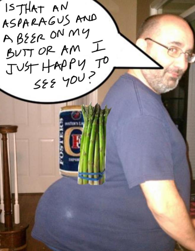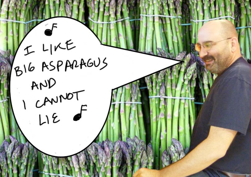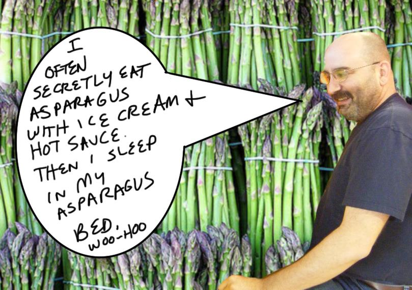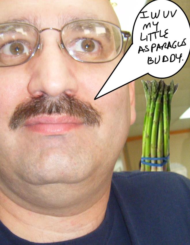 There's something very funny about these asparagi or is it asparaguses?Hmm.But back to the theme of today's blog. (It's "Asparagus is our funny but nutritional friend." OR it's "How much can I tease HIM with pictures of asparagus inserted into pictures with him?")