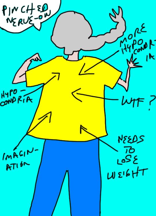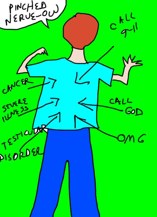 where the male patient points.Me: "I have a pinched nerve booboo." "Whateveh. Do some back exercises. Take some ibuprofen. Loose some weight. Don't let the door hit you on the ass on the way out."