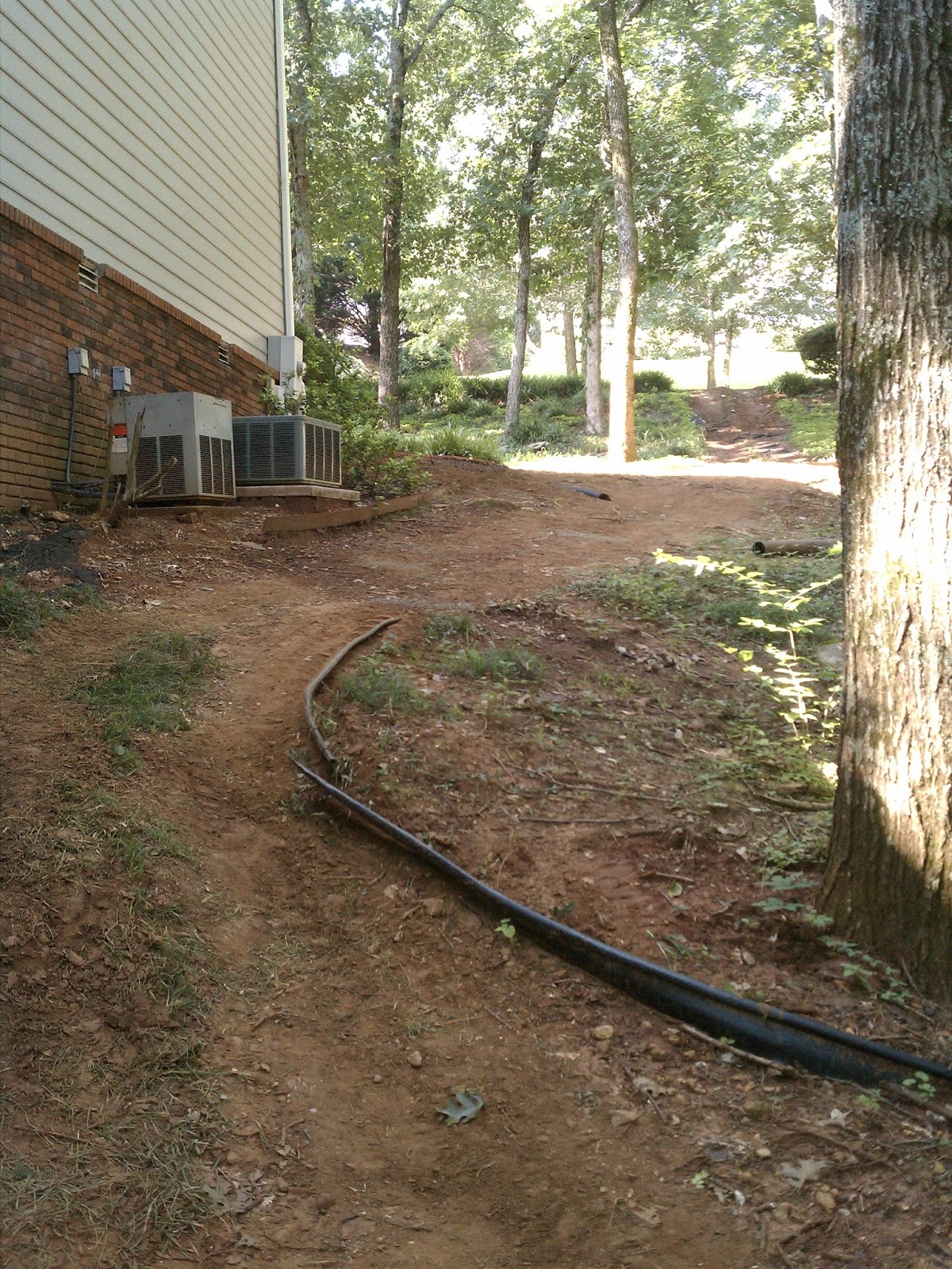 as we get an AC unit in there.While the guys were toting 85 pound bricks around, HIM, the man to whom I'm married, decided to build a drainage ditch next to the tree house. He rented a ditch witch and proceeded to break six irrigation pipes and lost two sprinklers in the process. It took longer to fix the broken pipes than it did to dig the trench. However, I have since learned that when one breaks a pipe, in order to fix it, one must dig it out by hand in order to have enough pipe visible to be able to cut it off in order to put on a new connection. By hand means digging with a shovel and then by hand. Then two of the connections he re-did leaked and had to be re-did again. Then the system had to be tested, the drainage hose put in, and reburied. I'm not sure where all the dirt went because we didn't seem to have enough dirt to fill in the trench, even with the big ass drainage hose in it. Anyway, my back hurts and there's about an inch of mud stuck to my stinky shoes.