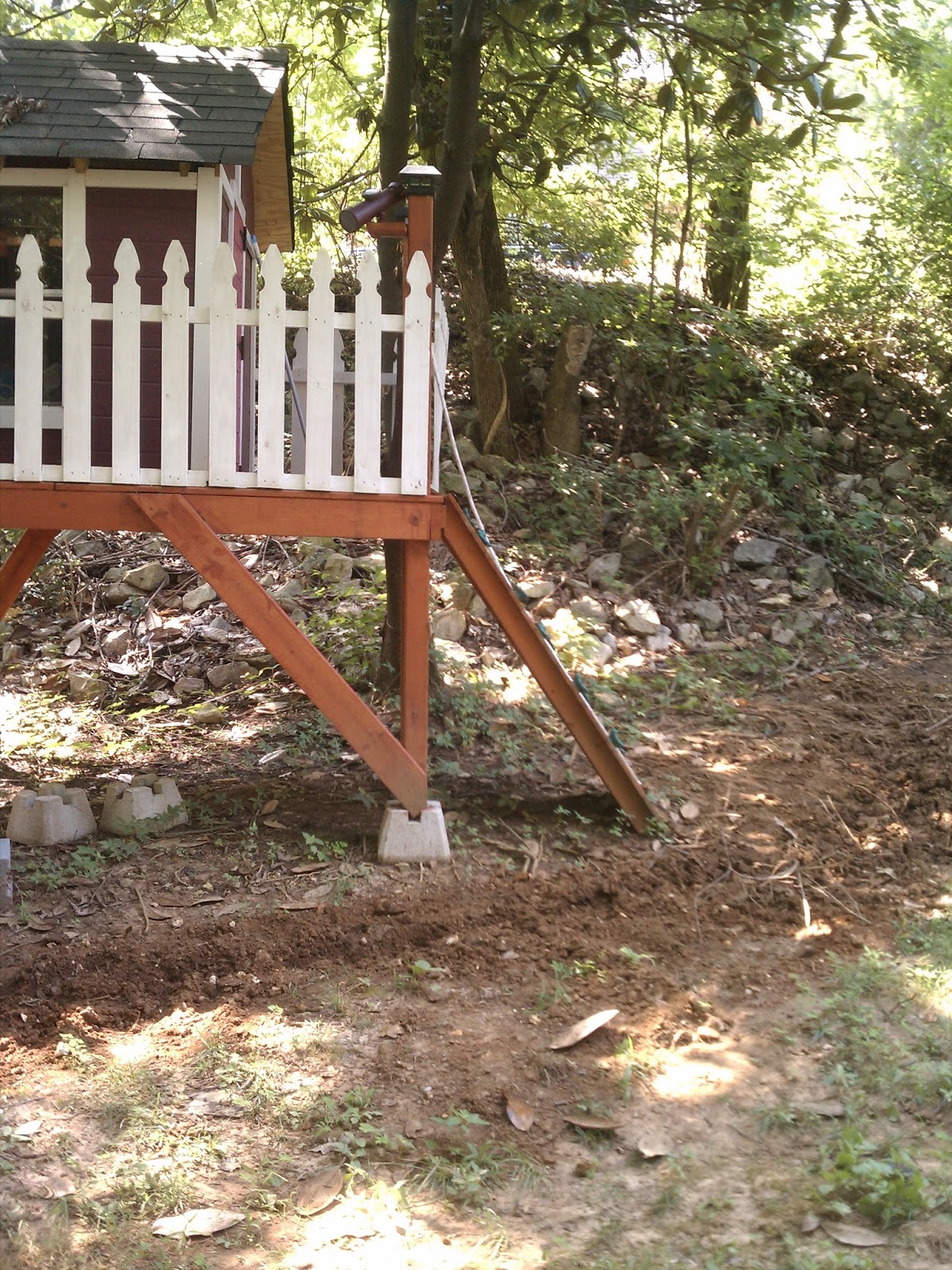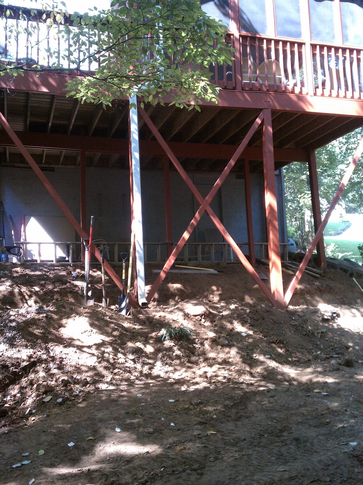 Very weird.No, it finally came to me while I was asleep. Apparently I haven't got anything better to dream about. A retaining wall built around the bottom of the supports will keep them from moving, and it shouldn't cost that much. (Hahaha. I said that, I actually said that, before we got some estimates.)