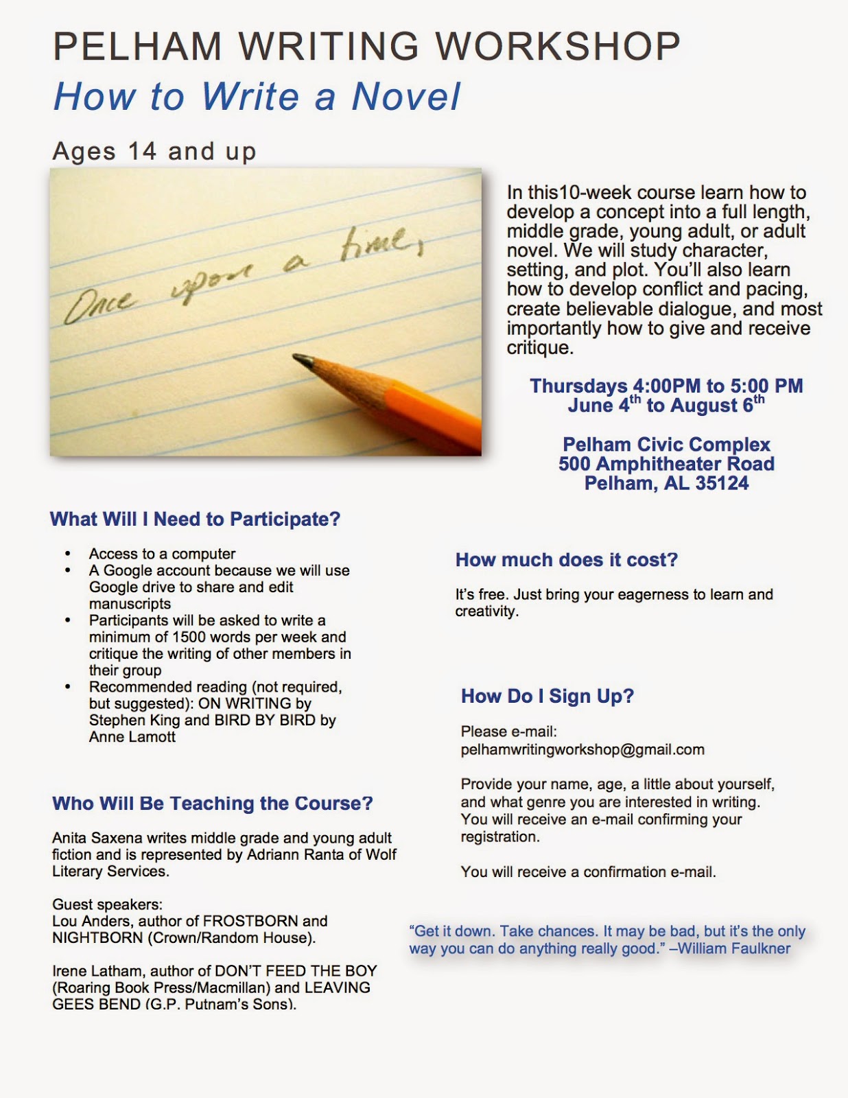 Every Thursday from June 4th to August 6th, Anita Saxena is going to be teaching a free course entitled "Pelham Writing Workshop: How to Write Novel" at the Pelham Civic Center, 500 Amphitheater Road, Pelham, AL 35124. I and author Irene Latham will be guest instructors on one night each of the course. I'm going to give my ScripTips outlining/structure talk on Thursday, June 18th, at 4:00 PM. Again, attendance is free, but you must be registered for the entire workshop, not just my day. To do so, or to inquire with questions, email pelhamwritingworkshop at gmail.com. (And copies of