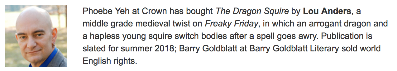 Phoebe Yeh at Crown has bought The Dragon Squire by Lou Anders, a middle grade medieval twist on Freaky Friday, in which an arrogant dragon and a hapless young squire switch bodies after a spell goes awry. Publication is slated for summer 2018; Barry Goldblatt at Barry Goldblatt Literary sold world English rights.