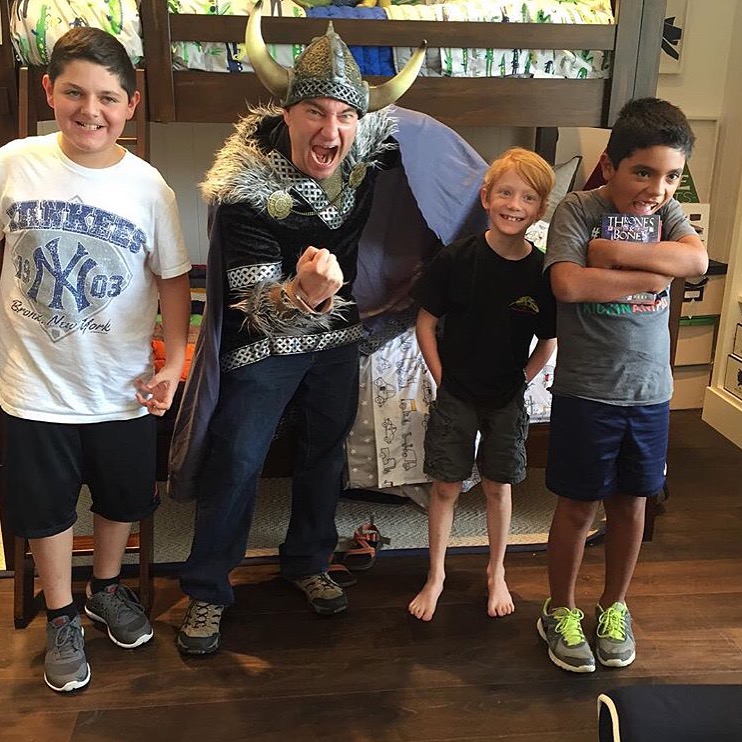 Also, it should be mentioned that I have a Viking helmet that has gone with me on most of the aforementioned travels. But there's a full costume with it that I have never worn publicly anywhere but Trick-or-Treating with my kids. At the last minute, on my way out the door, I decided to break it out, because if you can't go The Full Viking at Pottery Barn Kids, where can you?