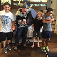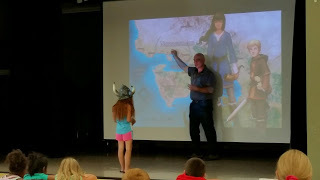 In the afternoon, I wrote my first ever attempt at a romantic scene. The current project isn't a children's book like the one I just finished. Rather, it's a YA or adult novel staring an older version of a character who is an adolescent in the Thrones and Bones books. Maybe because the character was 12 when I created her, I found myself oddly protective and parental. I had to fight the urge to let her be herself with *gasp* a boy. I kept wanting to come in and chaperone. It was the strangest sensation, and one I never would have predicted. If I'm this protective of a fictional creation, boy am I going to be in for it when my children are a few years older!After lunch, I taught my last two sessions of the Thurber summer camp. The kids at all of these workshops have been great, and this week's batch were no different. We had a great time learning about the basics of character creation and story construction. Also learning how to say "Norrøngard" as the old Norse would have pronounced it. (Although it's not a land found on earth, my Norrønir pronounce the name of their land in the same fashion.)