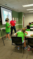 Today started off with a trip to John Burroughs Elementary School to visit their summer school camp, a grant-funded program to provide food and activities to students in a low-income area. There were 40+ kids, and they were on average a few years younger than I have been speaking to thus far. But they (and I) had a blast. I talked to them for about 15 minutes about my books, and then we did a writing exercise where they were shown some of Andrew Bosley's great art for my series and asked to fill in facts about the characters. And boy did we get some good names. A turbaned Uskiri scholar, for instance, was actually "Donald Trump" whose major talent was "screaming" and who wanted to "blow up the world" but who desperately needed "a breath mint." (That's presented exactly as the child wrote it and offered without comment.)