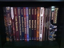Lately I've been collecting and perusing RPG manuals again, even if I don't have time to play them. Here's a shot of the bookshelf next to my bed: