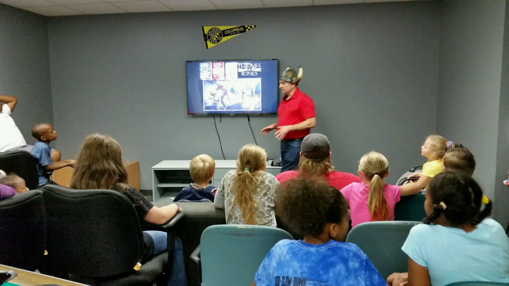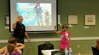 Today began with two back to back sessions of the writing camp at the Thurber Center next door. I taught two groups of approximately forty students total.I created a special presentation when I got to Columbus that lasts an hour. The first fifteen minutes are about my Thrones & Bones books, then I spend forty-five minutes teaching a writing workshop. This is a super-condensed version of my ScripTips presentation, broken into three fifteen minute parts with a writing exercise in each one. I'd given it four times prior to today, and--if I may say so myself--it's really come together. Plus, today's campers really felt engaged and enthusiastic (though that's been true the entire time I've been here.) The trading cards remain a big hit, as ever.