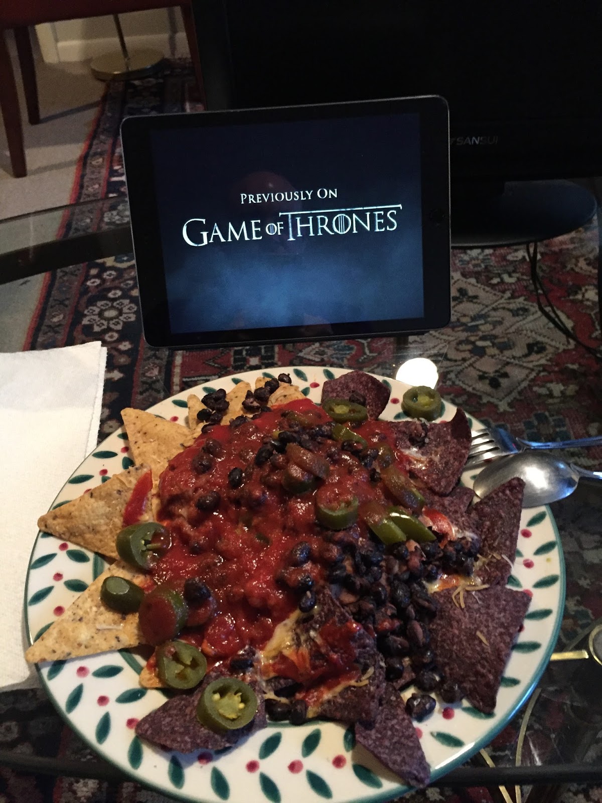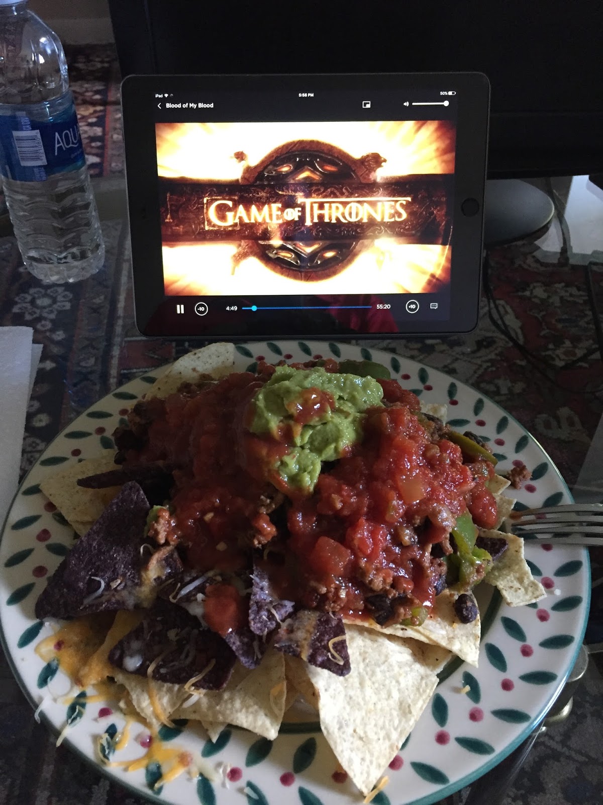 Then I came back and wrote for another two hours and I finished! Draft two of the secret project is done, and it's already been sent to a few of my volunteer readers.So this Herculean accomplishment must be celebrated in style, and it was--with a huge plate of nachos, Dragon's Milk, and catching up on episodes of Game of Thrones. (I'm not to the finale yet, but I'm getting there. So far, though, I prefer season five to season six.)