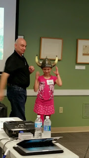 We set up in a recreation room and tapped into a wall-mounted television, where I gave a presentation to about twenty kids of varying ages on my Thrones & Bones series and my (abbreviated) ScripTips writing course. The kids were great--there was one boy in particular who really took to the material--and the Thrones & Bones trading cards that I gave out were a very big hit. As they always are.