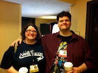 I'll pause and say a con has never worked me harder than Norwescon did, but as it had been eight long months since this stage-loving, egomaniacal, book promoter has been in front of an audience, that was just what the doctor ordered. What I heard from the other guests was that the con works you hard but takes good care of you, and I can testify that's the case. So let me stop and give a shout out to Dawn Marie Pares, my wrangler, who really made the show. She met me every morning with a decaf skinny vanilla latte, met me before every panel (often with tea), and made sure that while I was being taken care of, my family was too. Here she is with her husband, Matt Youngmark, author of the Choose Your Own Adventure-style zombie novel, Zombocalypse Now