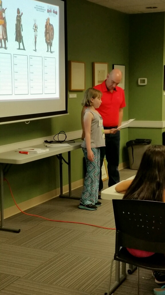 Then I taught two groups of campers back to back from 9:30 until 11:30. The kids were great and, to my tremendous relief, took to the material. Why is that a relief, you say? Well, it's like this. I have several presentations I usually give. One is an hour long presentation on the world of Thrones & Bones. One is a one or two hour presentation called ScripTips, which uses my particular take on cinematic story structure to teach plotting and outlining to would be novelists. And one, created recently, is an hour long workshop taking participants through exercises drawn from ScripTips lessons. Today, I combined all three of those presentations into one hour long performance. I felt a bit like the Doctor in that episode "Flatline" where he's stuck inside a shrunken TARDIS, everything compressed together tightly. But it went well, and now I have a new presentation I can do. And, as in each of these classes I've taught this week, while all the kids are bright, imaginative, and enthusiast, there's always a couple kids who really take to the material and set off writing their stories like wildfire. Which is always tremendous to see. (Future competition).