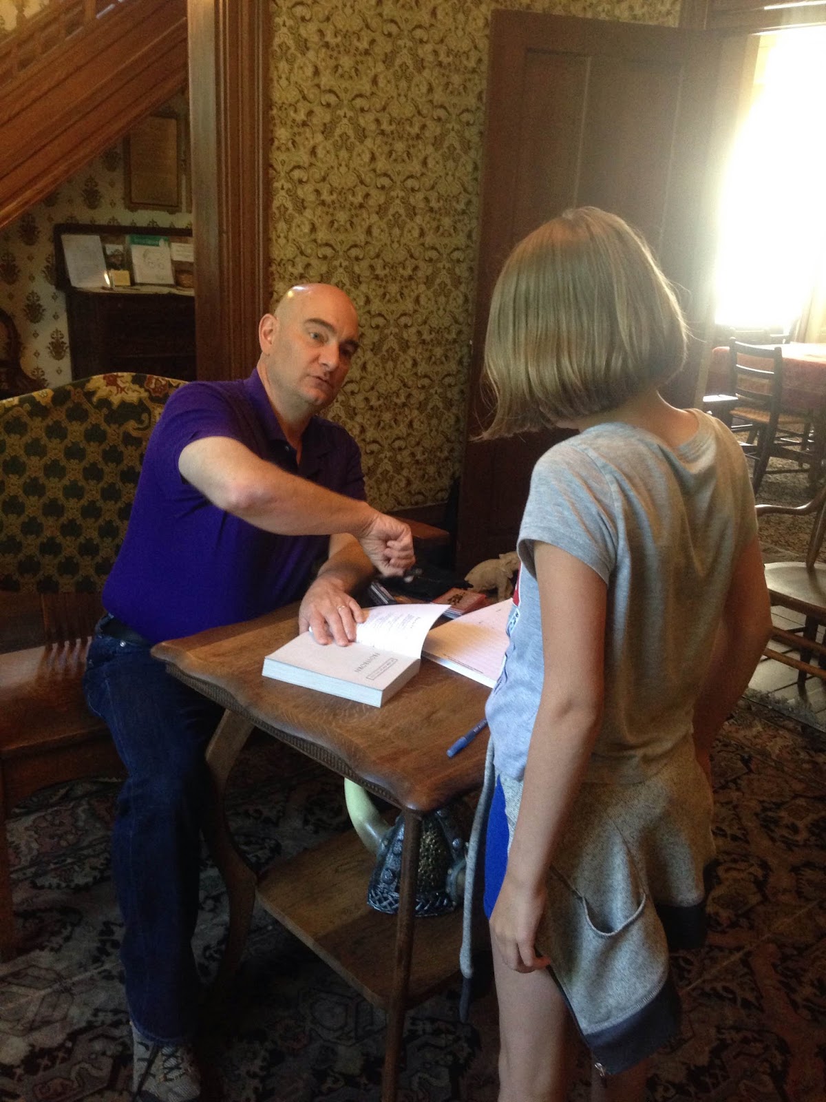 I stayed up late last night and was woken early by a phone call, but despite that I still managed to get halfway through the rewrite of my first draft of the recent project. Which is pretty good progress here in week one of my Thurber House Children's Writer-in-Residence stint. Then at 3:30 pm, the campers in the Thurber Center had a presentation for their parents, after which they brought their folks to Thurber House, gave them a tour of the first two floors, and best of all, has me sign copious copies of