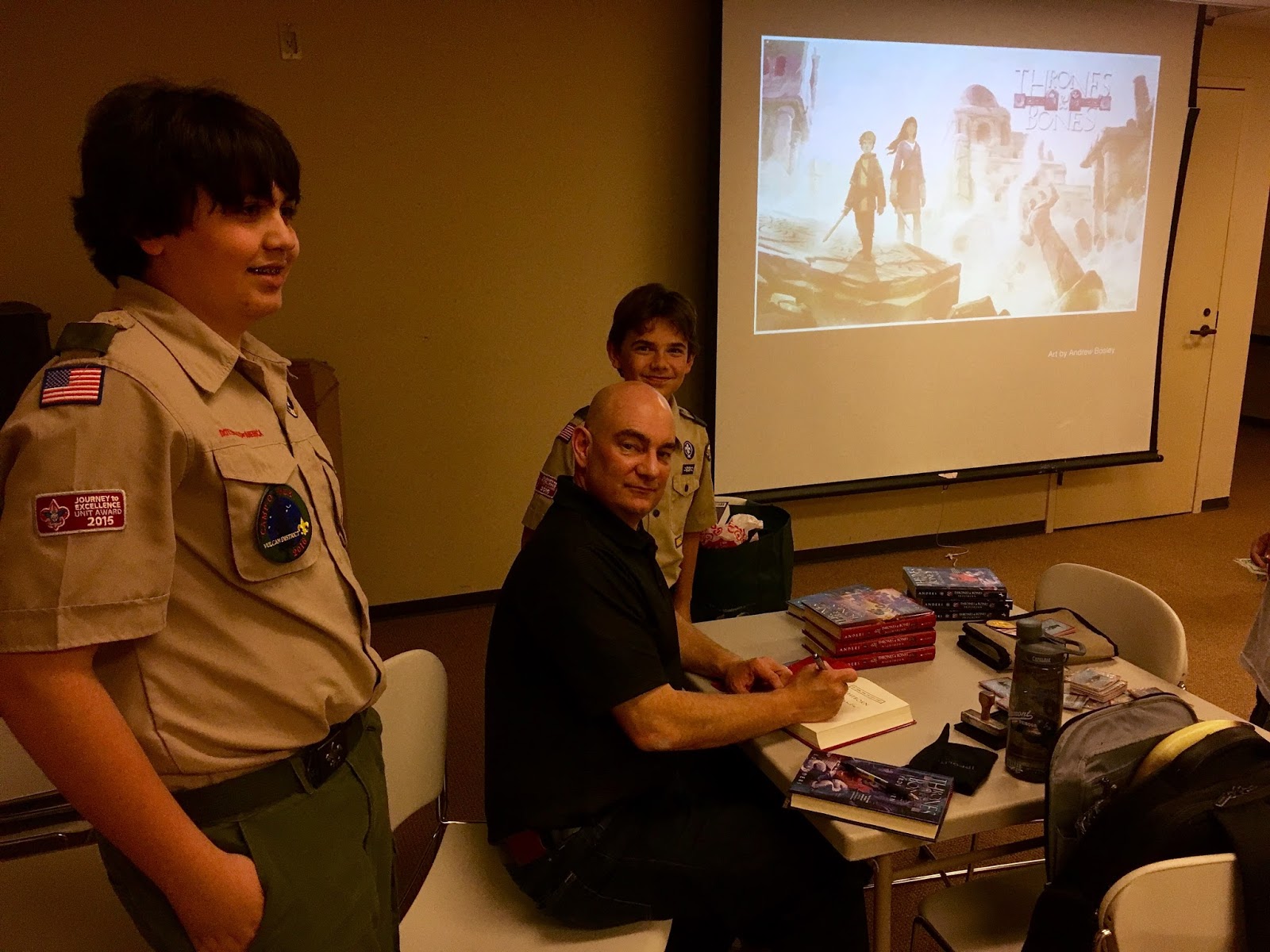 Last night, I spoke to a room full of Boy Scouts. The scouts were from several different schools, but in a room of about twenty scouts, only two had me visit their school before. I presented the world of Thrones & Bones, including a ton of amazing imagery created by artists Justin Gerard, Andrew Bosley, and Robert Lazzaretti. I showed pictures of my research trip to Norway. And I talked about the creation of the Thrones & Bones and Charioteers board games (which feature in the books Frostborn and Nightborn respectively, with rules for each included in the back of their books). Afterwards, I got to sign and rune-stamp books for the scouts.
