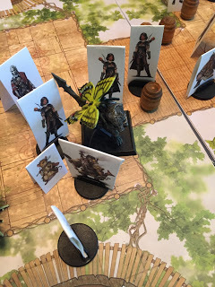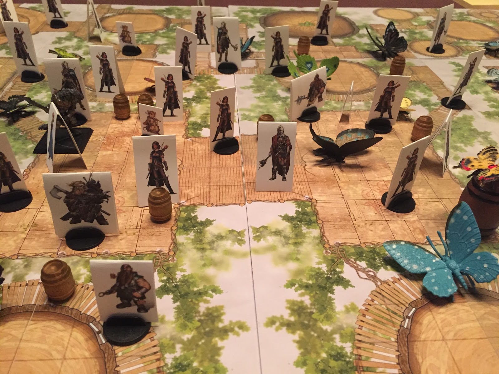 So next up, using a female wood elf drawn for me by the incredible Andrew Bosley, and supplementing with some found art, I made my own pawns and populated the city. We added a small number of Paizo's Pathfinder Pawns from the Beginner Box, and we used a ton of Pathfinder Pawn Bases. I picked up some pickle barrels from a craft store (and stained them with paint pens) to add some obstacles to the environment. And, because I saw one and it got me thinking, I picked up a Bunch-o-Butterfies too, because if there's one thing that's better than a crowded market high in the trees in an elven city, it's a crowded market high in the trees in an elven city during the festival surrounding the biannual giant butterfly migration! The game went incredibly well, with highlights being when Thurso Greenback, a wulver, ran across a giant butterfly's back to get from one wooden platform to the next, and Blitz Ironfist, a dwarven artificer, blasted across the market using his single-use jetpack. Also, Isha the cat person did some crazy parkour.