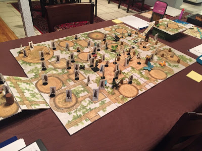 Also, for the first time, we played with miniatures and terrain. Fate doesn't require this at all, but I wanted to do something special to fire everyone's imaginations. Initially, I'd planned to use Rainn Studio's utterly magnificent TerraTiles (I have both the Misty Moorlands and the Coast & Rivers sets). And we will use them. But the way this campaign started, the team was supposed to get their marching orders in the elven city of Fair Shadow, a location that is mentioned but not visited in my novel