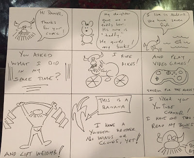 I got some wonderful fan mail today from a school in Delaware. One of the letters was written as comic book panels, so I thought it was only fair to reply to that one in kind.