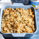 Instructions Preheat your oven to 350 degrees Fahrenheit.In a bowl, combine the avocado oil, garlic powder, onion powder, paprika, black pepper, thyme, mustard powder and salt. Fold in the cauliflower until the spice mixture coats all of the pieces of the cauliflower.Lay the cauliflower out in a single layer on a baking dish or sheet pan. Roast in the oven for about 30-40 minutes, or until the cauliflower is tender and golden. Allow to cool slightly.Place the cauliflower in a bowl and pour the No Dairy Cheez Sauce on top along with the milk. Stir to combine and then stir in the almond flour.Pour the cauliflower mixture into a greased 9×9 baking dish.Crush up your pork rinds in a bag. Crush them so that about half of the pork rinds form a coarse powder and the rest crushed up a bit less in order to give the mixture texture. Pour the pork rinds into a bowl and combine with the parsley and almond flour. Pour this mixture on top of the cauliflower and spread it all over the top of the cauliflower.Place the baking dish in the oven and bake for about 15-20 minutes, or until the pork rinds are golden. Allow to cool slightly and serve! NotesYou can roast the cauliflower ahead of time if you are in a bind, and combine the sauce and cauliflower and bake before eating.