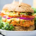 Our salmon burgers also come with a homemade slaw made with broccoli or cabbage slow then tossed with the chipotle lime mayo and squeeze of lemon. You can also add extra minced red bell pepper or green onion to this mixture if you’d like. As for additional toppings, feel free to mix and match based on your liking! We used sliced tomato and red onion this time around.