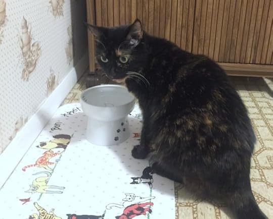 I purchased this water bowl late last year, when Ruby was so sick and I was trying to figure out how to get her to drink easily. She exhibited some very odd drinking behaviors as her kidney disease got worse, and I tried anything and everything I could think of, including this bowl. Sadly, it didn’t work for her. However, Allegra really likes this bowl, and I like what it’s doing for her.