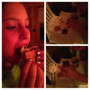 Here’s a peek at preparations for the s’more-making contest we had. The kids were coming up with some serious strategies…