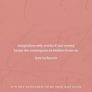 “You will begin to look at other people’s lives and see all the shiny new things they have. It will start off as a small seed of jealousy that will grow until you rationalize you deserve those things, too. You will make an extra purchase online and bend the monthly budget just a smidge. But it won’t stop there. Sin and secrecy have ravenous appetites. Before you know it, you’ll be hiding credit card bills from your husband, being dishonest in your relationships, and facing a growing amount of debt. Your seemingly small decisions today will not only affect you, but they’ll ultimately lead to the division and possibly destruction of your family and the peace you took for granted.”