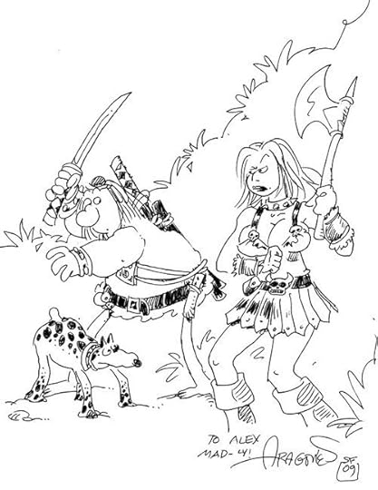 Today is the birthday of one of my all-time favorite cartoonists, Sergio Aragones. I was lucky enough to commission this sketch of Marla the Barbarian from my Lower Regions meeting Groo the Wanderer. Needless to say, if my 12 year-old self ever finds out about this he will wet his C-3PO Underoos.