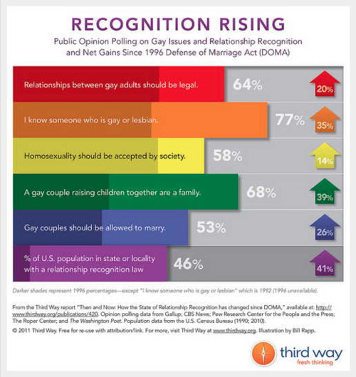 Fifteen years ago this month, the U.S. House of Representatives passed the so-called Defense of Marriage Act (DOMA). The bill, which defined marriage as a union between one man and one woman under federal law, passed by a vote of 342-67—an outcome that roughly reflected public opinion at the time. But over the past decade and a half, our society has undergone a seismic shift in how it recognizes and accepts the relationships of gay and lesbian couples. This report provides a snapshot of this dramatic transformation and illustrates the crystallizing consensus in favor of legal relationship recognition for gay and lesbian couples, extending all the way to marriage in many parts of the country. In 1996, DOMA was thought to have ended the debate on marriage. But it seems to have been only the beginning of a more profound shift in favor of gay and lesbian couples.