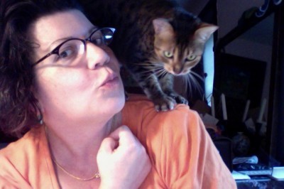 I post this so that you are all aware of what it looks like around here when I am writing books. Fez rides into literary battle on my shoulder on a regular basis.
