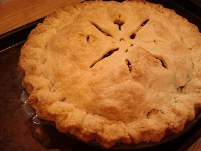 Then you bake your pie. How long? Until the top crust is sweetly golden all over. Not brown, just gold. But definitely not pasty white. The small amount of browning is crucial — the crust tastes better, the texture is better, and the additional cooking time it takes to get the pie nice and golden is a good way to make sure your fruit is thoroughly cooked. Usually this takes about an hour, maybe a little more or less depending on your oven and whether you're cooking anything else in the same oven at the same time. You're allowed to start peeking to see if doneness has been attained at around 45 minutes of baking time, but remember that every time you open the oven to peek, you let heat out and so it will actually take a little longer than you think.