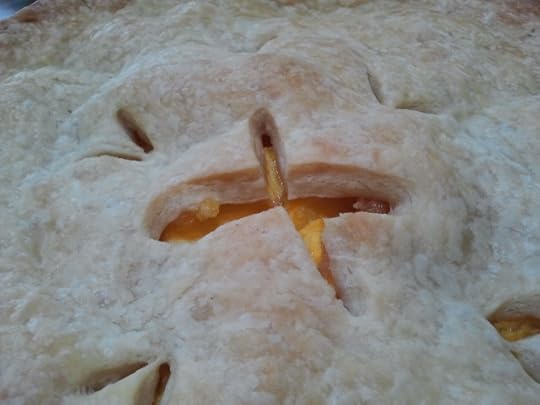 The pies all came out beautifully. In the photo above, the peach pie (regular wheat flour crust) is at bottom; the gluten-free blueberry is up and to the right, and the gluten-free Shaker lemon pie is up and to the left.