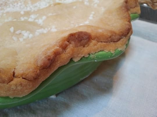 At the edge of the gluten-free Shaker lemon pie, you see a fine-grained texture with none of the layering or puffing. It looks more like shortbread, and acts like it, too.