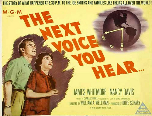 I’ve seen this before, but it aired on TCM recently, so I decided to give it another look, mostly because film critic J. Hoberman devotes some space to it in his history of postwar movies, “Army of Phantoms.” The movie is a ham-handed fable about what happens when the voice of God (yes, that voice of that God) begins making regularly scheduled radio broadcasts. Because we never hear the voice (mostly thanks to some semi-clever editing), we’re left to gauge its impact by observing an all-American family consisting of dad (James Whitmore), mom (Nancy Reagan) and son (Gary Gray), all unpleasant in their own special, boring way. You can tell this is a fable because their names are actually Joseph and Mary (and Johnny) Smith, but the movie never does anything imaginative with its admittedly outlandish premise except to reassure us that God’s looking out for the good ol’ U.S. of A after all. The single memorable scene in the whole movie comes when Joe gets drunk with a doubting buddy at a sleazy bar, but soon enough he regains his moral equilibrium and then it’s back to life on the straight and narrow. Too bad.