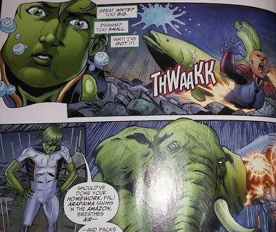 Everyone gets a chance to show off their powers, with Beast Boy transforming into my daughter's favorite animal in the whole wide world, the South American fish the Arapaima, beautifully drawn by Miguel and Dexter...