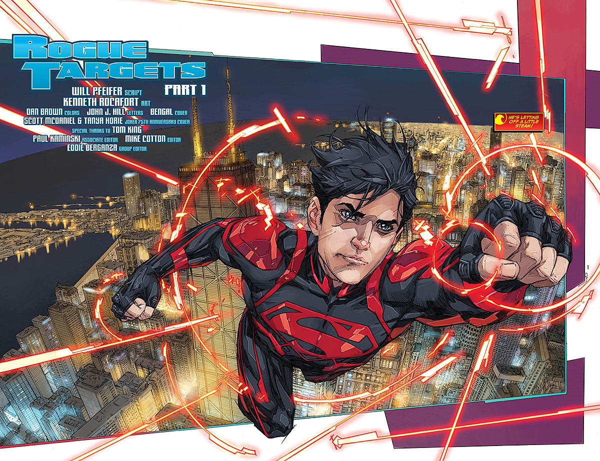 Script by yours truly, pencils by Felipe Watanabe, inks by Trevor Scott, colors by Dan Brown, letters by John J. Hill and editing duties by Paul Kaminski, Mike Cotton and Eddie Berganza. It all comes wrapped up in this action-packed, vertigonous cover by Bengal...