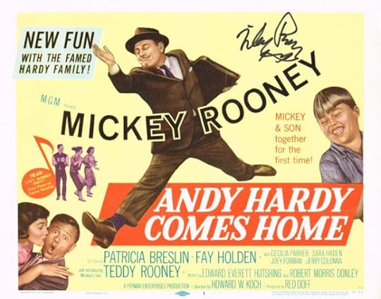 My strange, largely unexplained (and unexplainable) fascination with the late Mickey Rooney continues with this movie, the final film in his fabled "Andy Hardy" series of family comedies. This one, released in 1958, catches Andy returning home to the mythical Midwestern town of Carvel to help his company building a missile parts factory there. (No, really.) Naturally, everything gets all screwed up, but just as naturally, everything is smoothed over in the end, all the folks remain friends and the missile parts factory finds a new home in Carvel. By the way, despite the prominence of Rooney's own kid, Teddy, on that poster, he's barely in the movie. Apparently he wasn't a screen presence anywhere near the order of his old man. Looked eerily like him, though.
