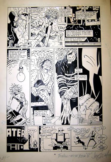 Here's another Grendel page by my pal Jay Geldhof, from a later run in the series. I'm pretty sure it's from issue 29 (cover date March 1989), and though this is when Jay and John K. Snyder were trading off penciling and inking duties, this issue was, I believe, an all-Geldhof production (with Grendel creator Matt Wagner writing, of course). Like all the art I'm showcasing here, this is a strictly pre-digital effort created with actual pen and ink, plus the occasional piece of pasted-down art (like the Bride of Frankenstein image in the top panel).