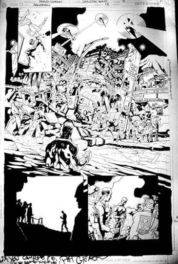 No words on this original page, but what just happened is that Aquaman has revealed to all the former surface dwellers living in Sub Diego (formerly San Diego) that they now breathe via gills and can never go home again. His telepathic balloon says "I'm sorry," and everyone else's says "NO!" Sad scene, sure, but a beautiful splash page by Pat, with an insane amount of scene-setting detail rendered clearly and cleanly, adding to the power of the moment instead of distracting from it.