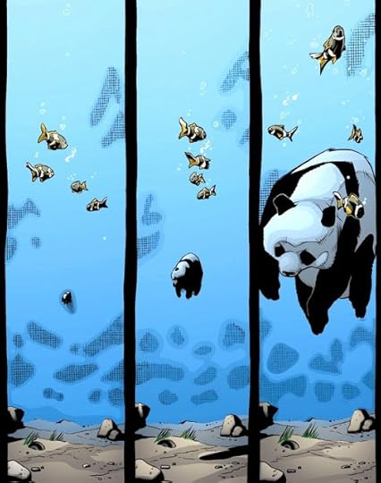 One day, most of San Diego (including, yes, the convention center) plunges into the Pacific Ocean, and Aquaman has to (a) try and save anyone he can, (b) figure out what the hell happened, and (c) help the survivors adjust to their new lives as ... water breathers. It's a big, epic, superhero story that includes a trip to the Justice League headquarters on the moon, guest appearances by Batman and the Martian Manhunter and, to kick things off, this page featuring an adorable panda in a less-than-adorable situation ...