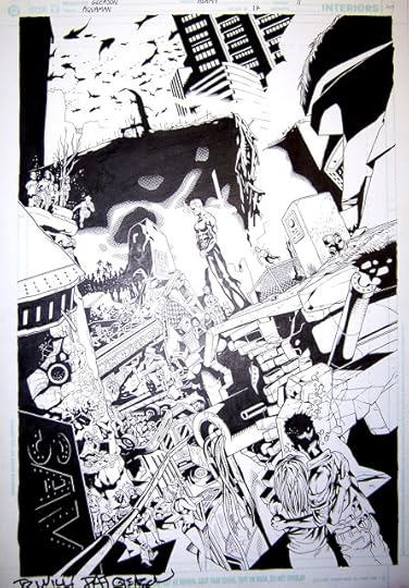 No words on this original page, but what just happened is that Aquaman has revealed to all the former surface dwellers living in Sub Diego (formerly San Diego) that they now breathe via gills and can never go home again. His telepathic balloon says "I'm sorry," and everyone else's says "NO!" Sad scene, sure, but a beautiful splash page by Pat, with an insane amount of scene-setting detail rendered clearly and cleanly, adding to the power of the moment instead of distracting from it.You can't have this page (Pat gave it to me, generous guy that he is), but you can have the colored and lettered version included in the just-released AQUAMAN: SUB DIEGO trade paperback that collects our entire run, including the Alan Davis covers and some pencil pages by Pat. Read more about it here. (How's that for a shameless plug?)