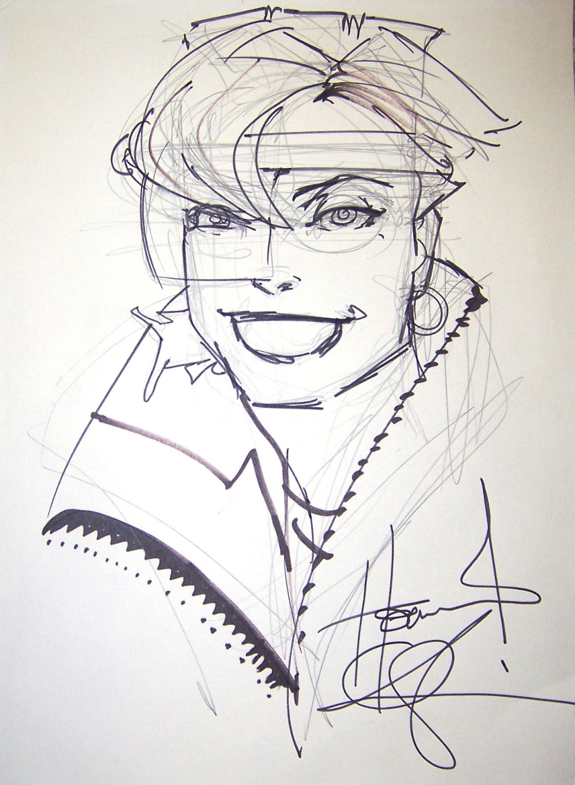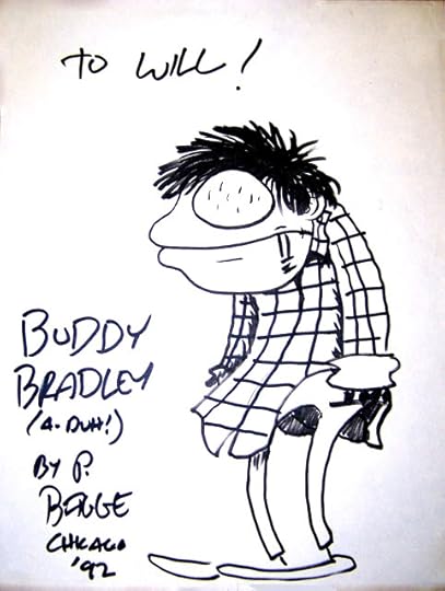 Picked up this swell sketch of Buddy Bradley (a-duh!) at the 1992 Chicago Con, which is the only show I think I've ever seen the esteemed Mr. Bagge at. I still think his HATE is the great unsung comic book of the 1990s and beyond, and one of the purely funniest things I've ever read. Back in college, even before HATE hit the stands in 1990, my college roommates and I loved the Buddy Bradley stories in Bagge's NEAT STUFF (especially "Hippy House," a book-length epic I still think ranks among the best single issues I've ever read.) I'm glad that, between biographies of Margaret Sanger and strips for Reason Magazine, Bagge still finds time to update us every so often on what's going on with Buddy and his brood. In their own way, those stories are just as meaningful and real as the stories of Maggie and Hopey that Bagge's fellow Fantagraphics creator Jaime Hernandez is telling in LOVE AND ROCKETS.
