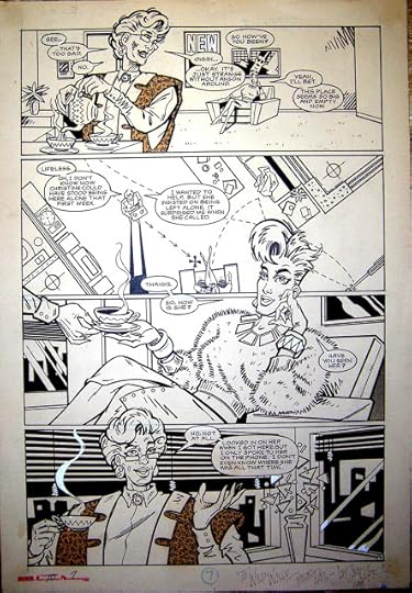 This one's not a con sketch. It's an actual page of original art that was printed in a comic book (GRENDEL #10, to be exact.) In fact, it's so old (cover date July 1987, which means this was drawn at least a few months earlier) that it still has actual lettering and screen tones as part of the art -- any sort of computer creation or composition still being years away. The pencils are by Jacob and Arnold Pander, but it's the inks we're focusing on here, because they're courtesy of my old friend Jay Geldhof. I first met Jay in the fall of 1986 during my sophomore year at Kent State, and he was knee deep in inking this Grendel arc during that time. He kindly gave me this page, a vintage slice of genuine '80s comic book art. It wouldn't be the last Grendel page he'd give me -- but more on that in the next installment.